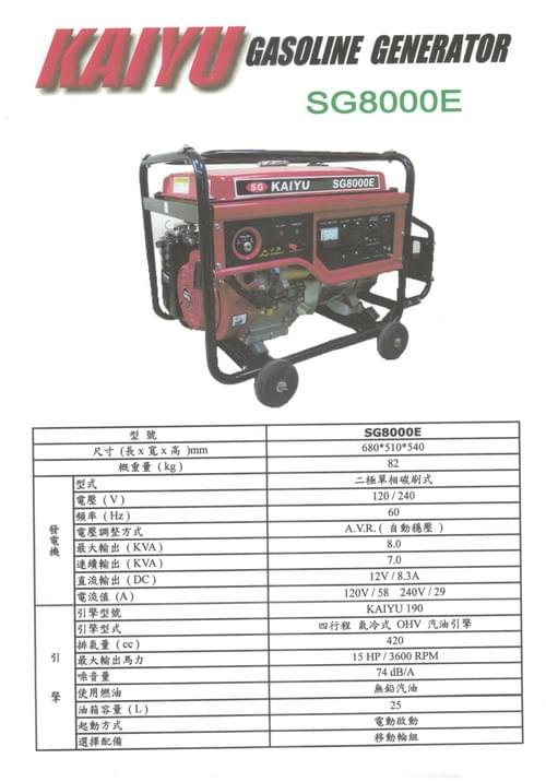 6、引擎型號:KAIYU 190 四行程 氣冷式 OHV 汽油引擎。